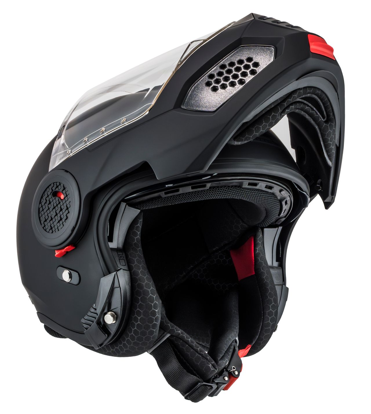 Med ett enkelt knapptryck fälls hakpartiet upp, vilket ger bättre ventilation och smidighet vid stopp eller lugn stadskörning.