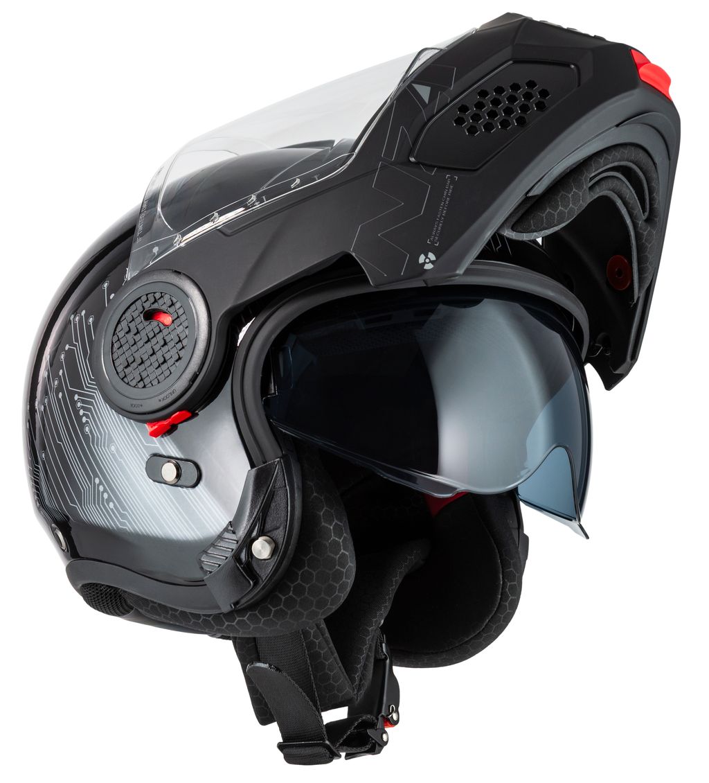 Tack vare dubbel P/J-certifiering enligt ECE 22.06 kan du köra tryggt både med hakpartiet stängt på motorvägen eller uppfällt i stadstrafik.