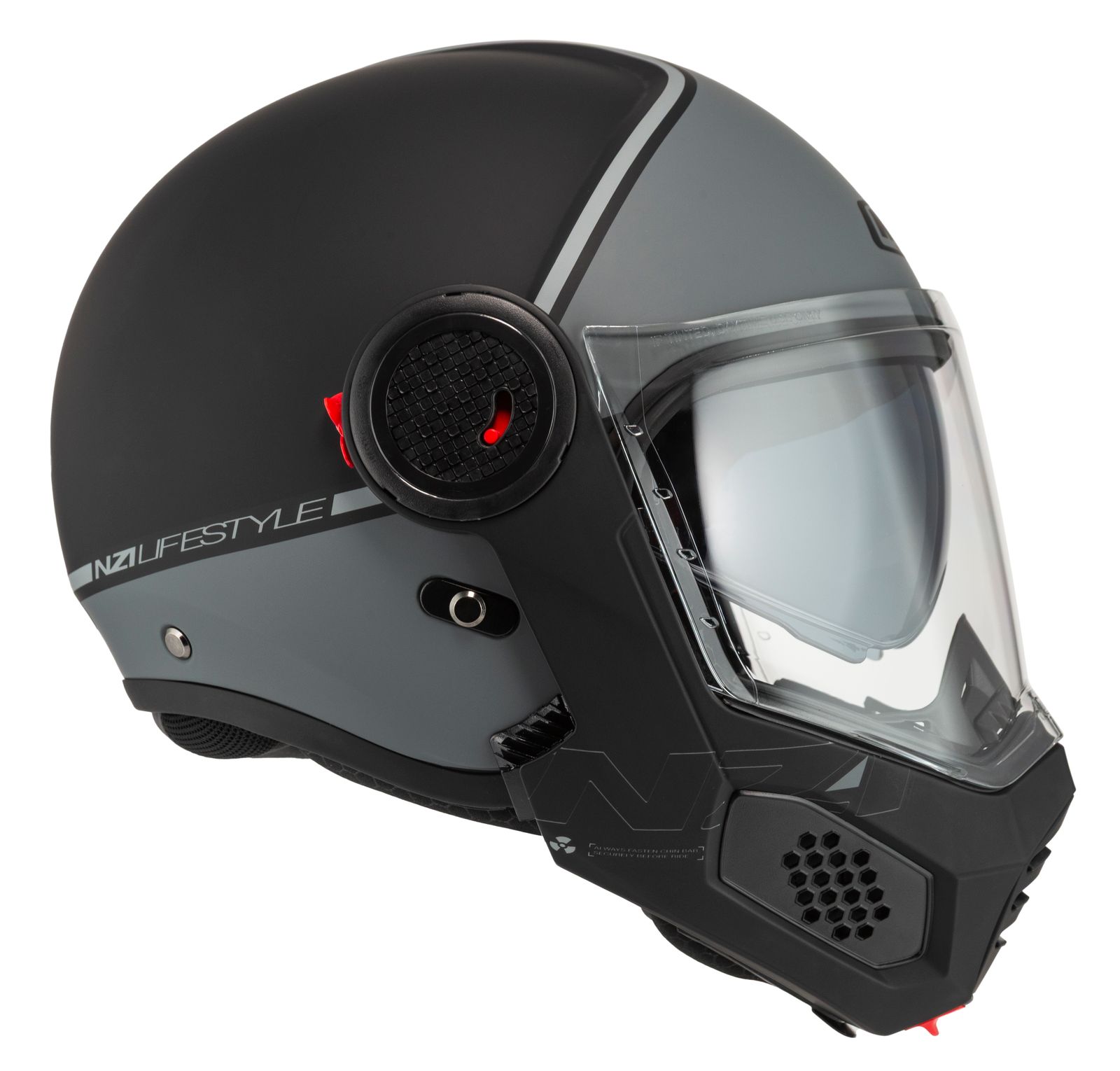 Med ett enkelt knapptryck fälls hakpartiet upp, vilket ger bättre ventilation och smidighet vid stopp eller lugn stadskörning.