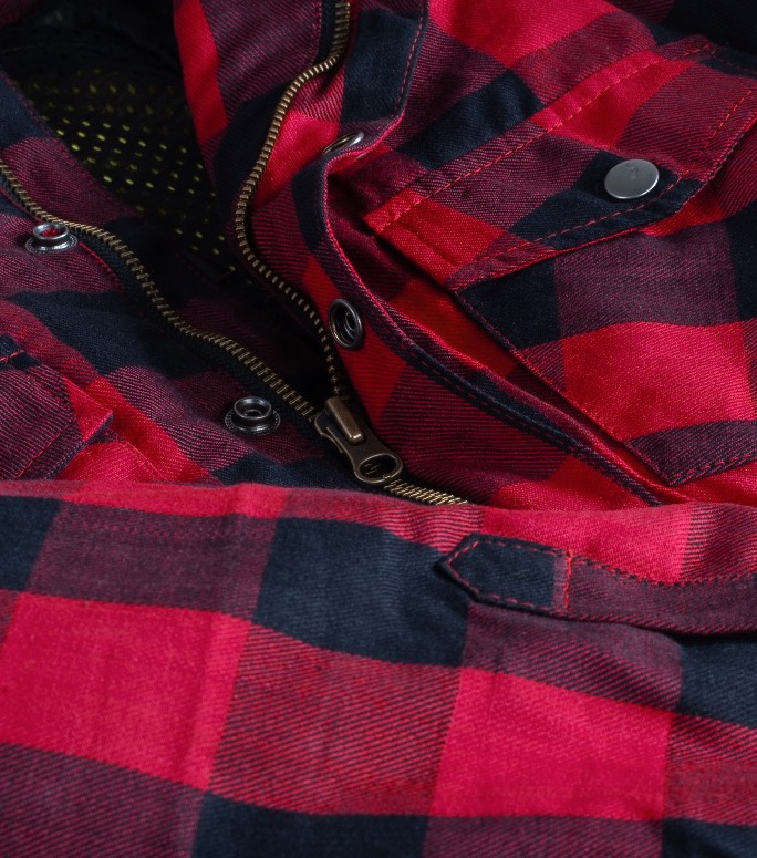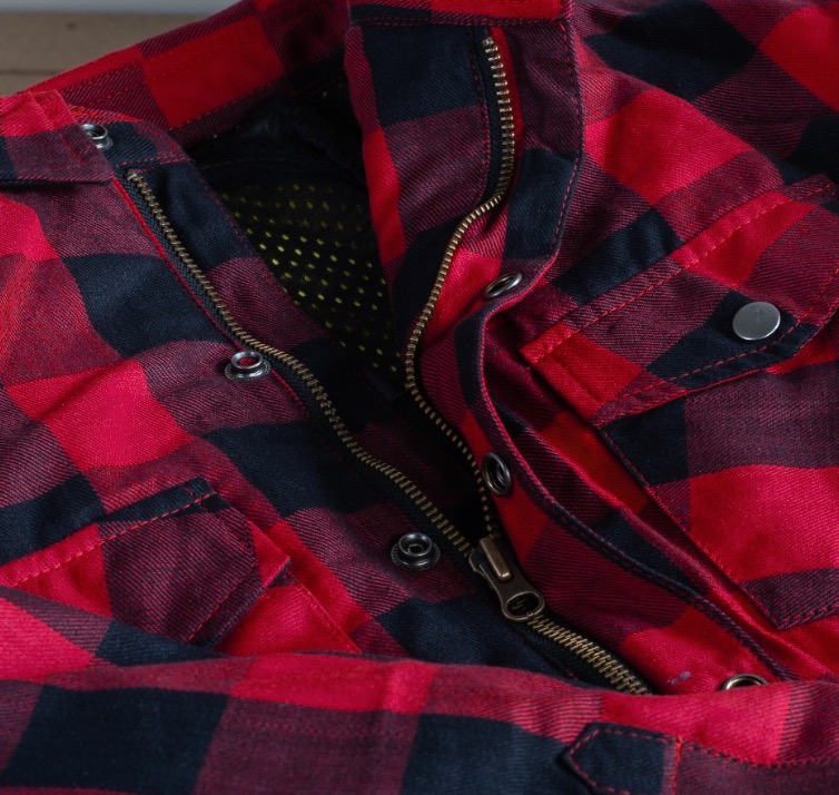 Flanell motorcykel skjorta kombinerat med hög säkerhet med CE Level-2 skydd för axlar och armbågar samt ryggplatta ingår.