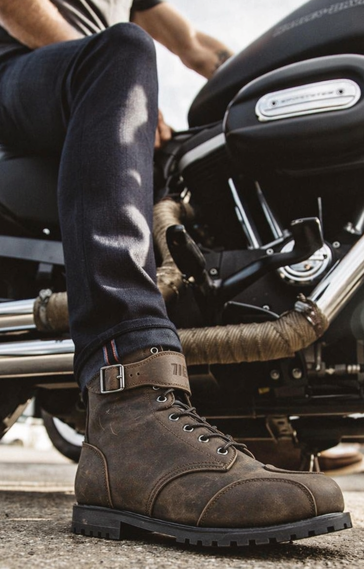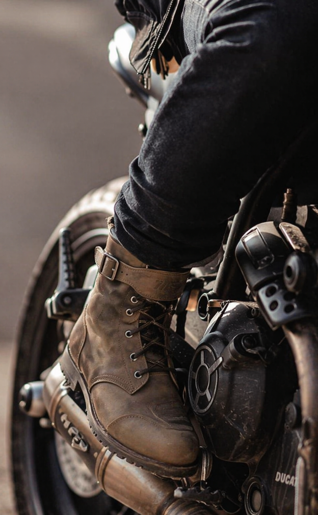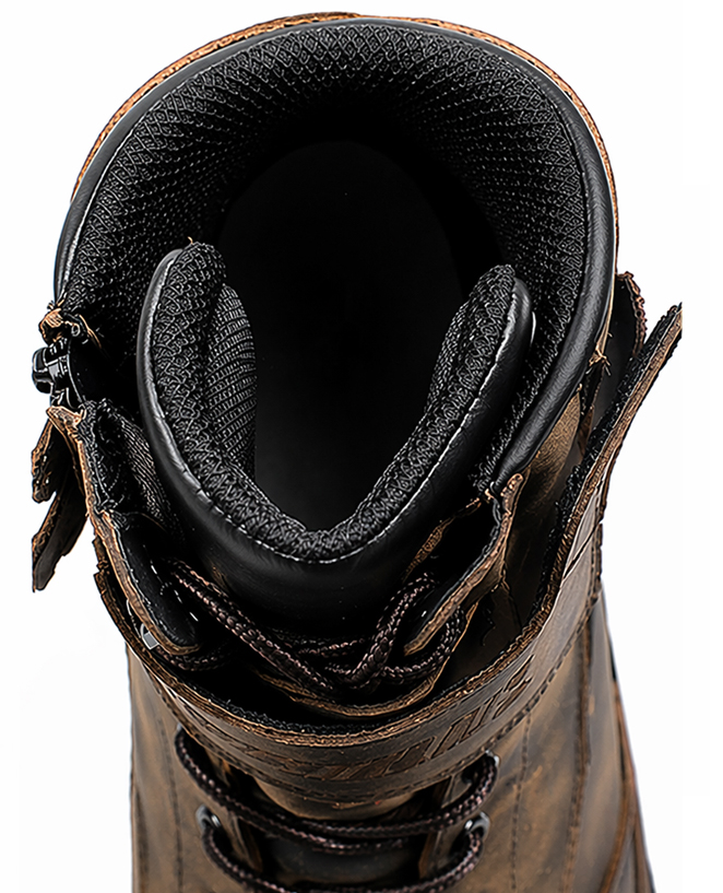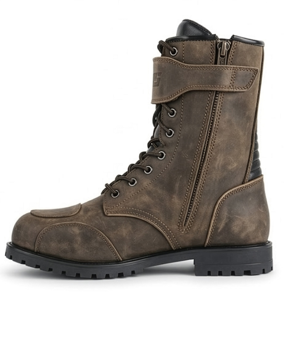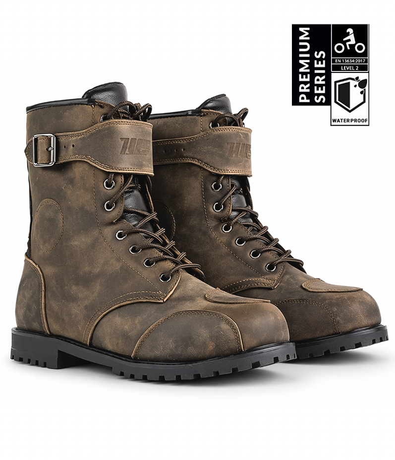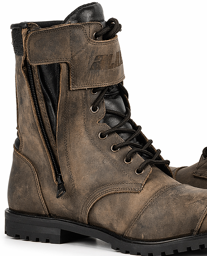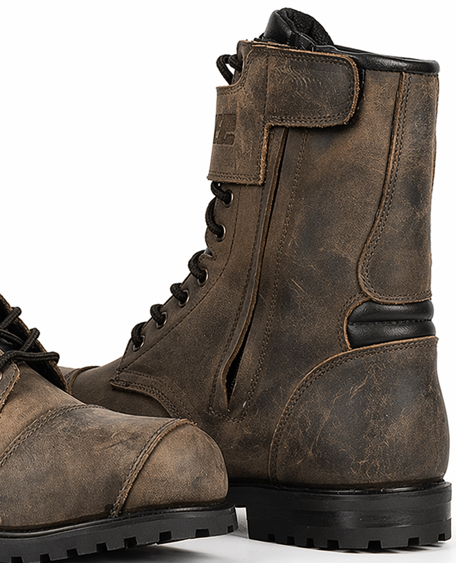 En robust och stilren MC-stövel i äkta skinn med en klassisk vintage-look som kombinerar tidlös design med modern säkerhet. Den slitna bruna finishen ger ett rått och autentiskt uttryck, samtidigt som stöveln är utvecklad för att möta kraven från dagens motorcykelförare.